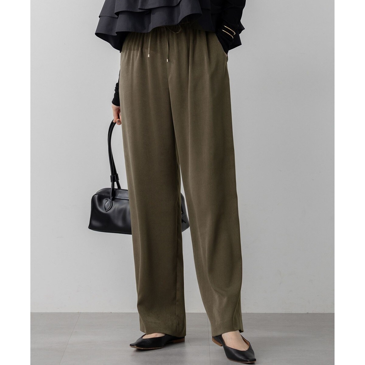 ウエストがドロスト仕様になったストレスフリーに穿けるワイドパンツ。シルエットはワイドながらも広がりすぎないので、様々なトップスとの相性も良く着回しのきくシンプルなボトムです。程よい厚みで晩夏~冬まで長く着られるのもうれしいポイント。同素材のシャツとセットで着ると、抜け感がありつつお洒落な印象を与える秋らしいスタイリングになります。カラーは、スエードらしさが演出できるキャメル(#034)、アイボリー寄りの明るいベージュ(#033)、甘すぎないシックな雰囲気のカーキ(#054)の3色展開です。