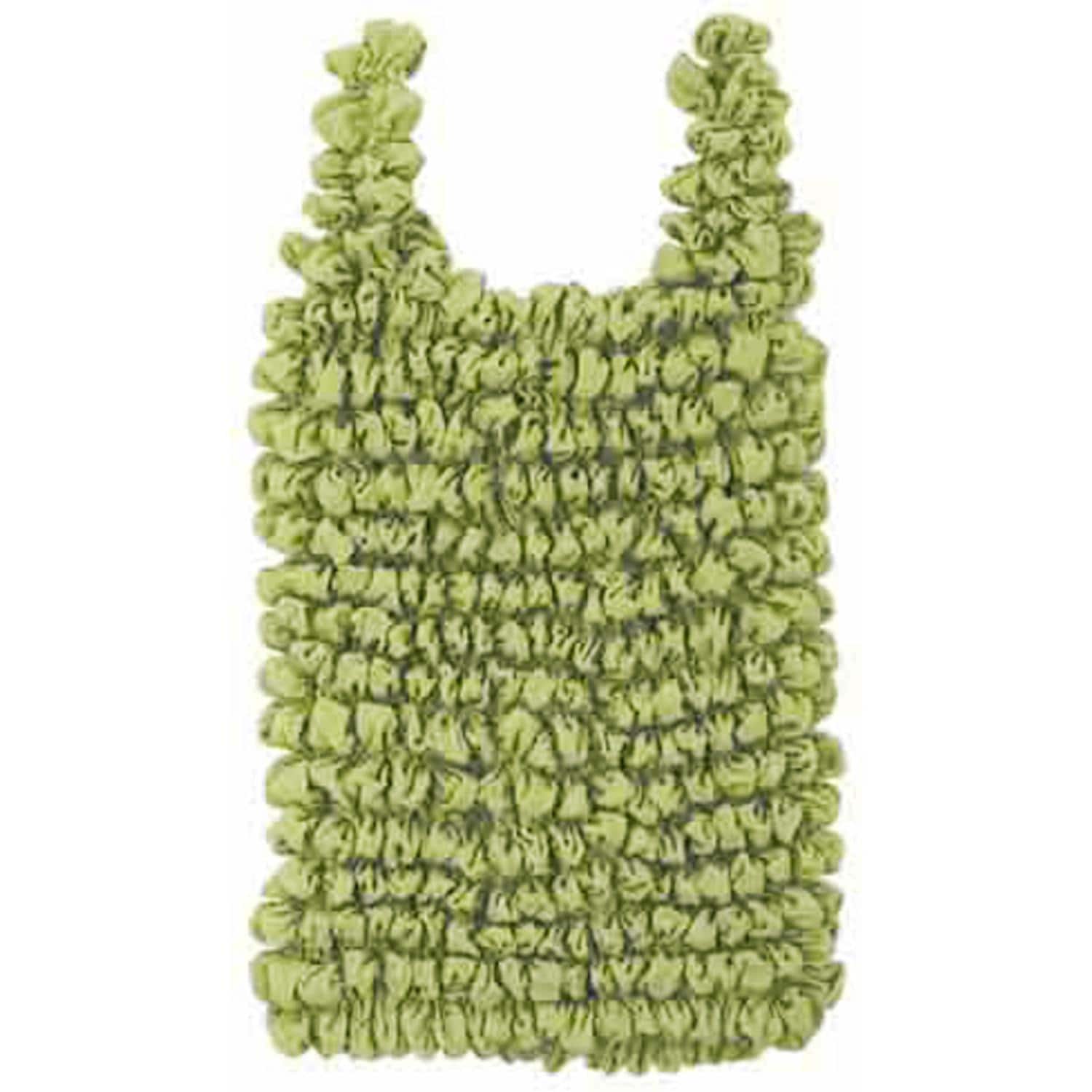 加工前生地サイズが、横約45cm×高さ60cm(持ち手含む)のバッグに絞り加工を施し、縮みを加えて小さなサイズに。