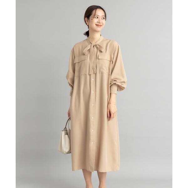 胸元のポケットがアクセントになったワークディティールのデザインに、衿元に付いたボウタイが顔周りに華やかさを出してくれるワンピース。