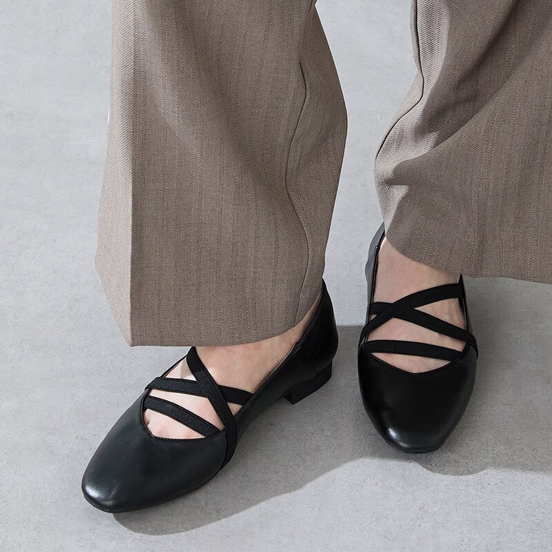 踵が踏めるバブーシュデザインのフラットパンプスは、複雑に配置されたゴムベルトで足の甲にしっかりとフィットしながらもどこか遊び心を感じさせるデザインに。程よく丸みのあるスクエアトゥに、履き口はVカットにすることで女性らしさをオン。厚手の中敷クッションに加え、先芯まで柔らかいものを採用することで、フィット感や履き心地を追及したこだわりのパンプス。