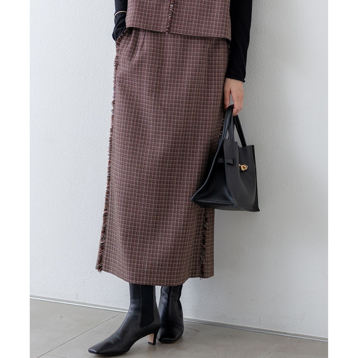 すっきりとしたIラインスカート。表情のあるツイードライクな素材感を生かすために、シンプルなシルエットに仕上げました。タテのラインにフリンジをきかせアクセントに。同素材のジャケットやブラウスとセットアップでの着用もおすすめです。カラーは、華やぎムードのレッドミックス(#310)、季節感のあるブラウンチェック(#335)の2色展開です。