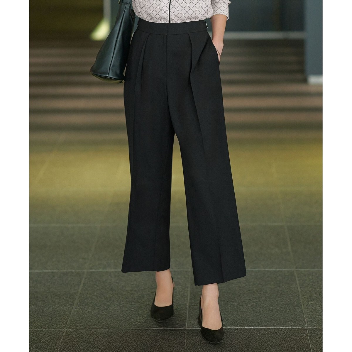 ■デザインウエスト部分のサイドバックルディテールが特徴的なセンタープレス入りのワイドパンツです。ウエストのタックによりヒップ周りに程良いゆとりが生まれ、ボディラインを拾いにくいフォルムのパンツです。さらにウエスト部分はゴム内蔵のスマートバック仕様で、ラクな履き心地なのも嬉しいポイントです。同素材のジャケットやブルゾン、キャミソールブラウスと合わせてセットアップはもちろん、単品でも着回しの利くアイテムです。