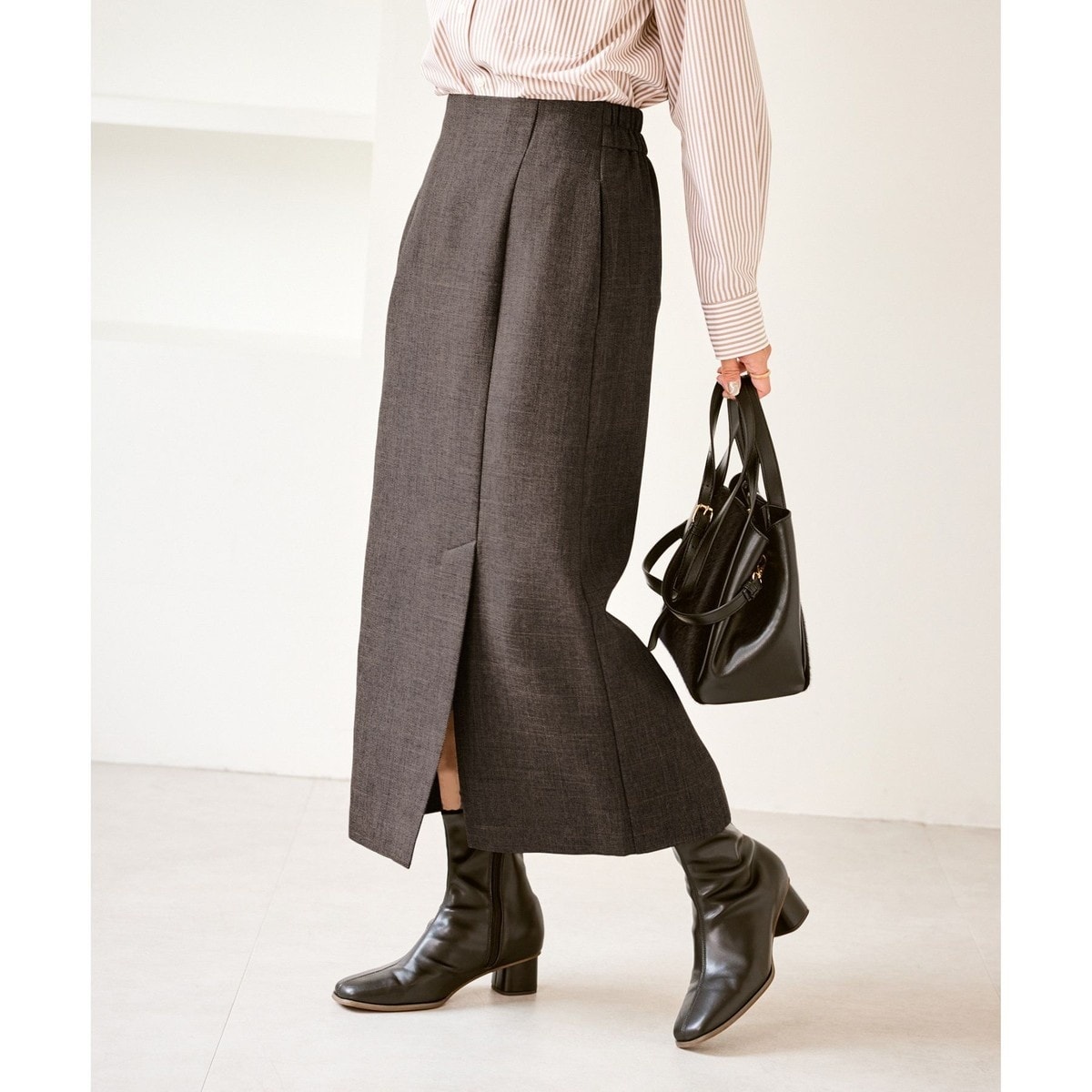 ・ショートブーツからロングブーツまで相性が良く、足元を変えるだけでがらりと印象チェンジが可能。パンプスを合わせればよりエレガントな雰囲気に。