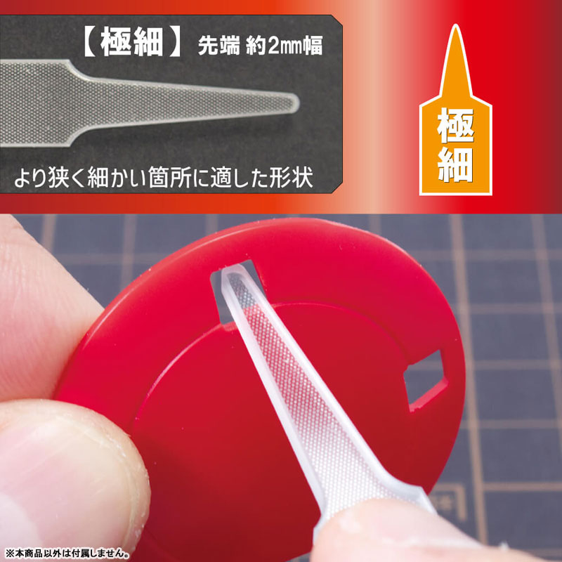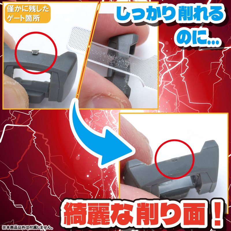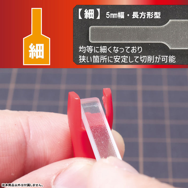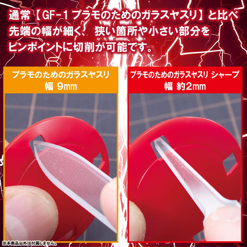 狭い隙間の切削にも適した「シャープ」。別売りの「プラモのためのガラスヤスリ」同様の切削能力と研磨能力を持ちながら、より多彩な用途にも使用しやすくなりました。