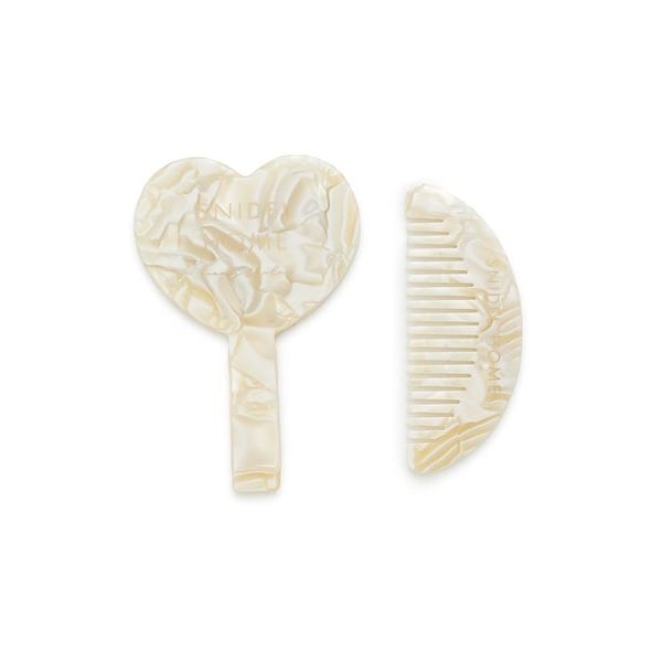 様々な表情のアセチ生地を使用した、ハート型ミラーと小さなコームのセット。