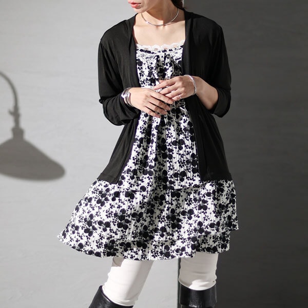 チュニックにトッパーカーデを羽織っているかのような、1枚でコーディネートが完成するラクチン便利なチュニックです☆花柄プリント胸元のリボンがポイントになってフェミニンな印象に◎胸下のフリルの切り替えでスタイルアップも叶います!着るだけでコーデが完成するので1枚あると重宝すること間違いなし☆