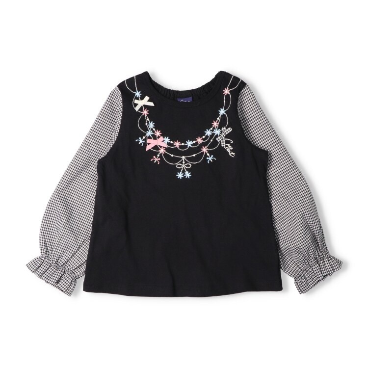 ネックレス風刺繍が可愛い!袖は千鳥格子チェック柄の布帛の異素材切替デザイン。リボンのモチーフもポイント!襟ぐり後ろ部分がゴム仕様になっているので、着脱もスムーズに出来ます!カジュアルにもお出かけにもオススメなアイテム。【アイテム】トップス シンプル ガーリー フェミニン カジュアル お洒落 オシャレ かわいい 可愛い 普段着 デイリーウェア お出かけ着 お外着 お外遊び着 子ども こども 女児 女の子 ガールズ キッズ ベビーサイズ トドラーサイズ 幼稚園 保育園 小学校 通園 通学 小学生 2025年秋冬物新作 丸高衣料 ロングスリーブ 長袖 ブラック 黒色 ピンク クレセント コットン100% 綿100%