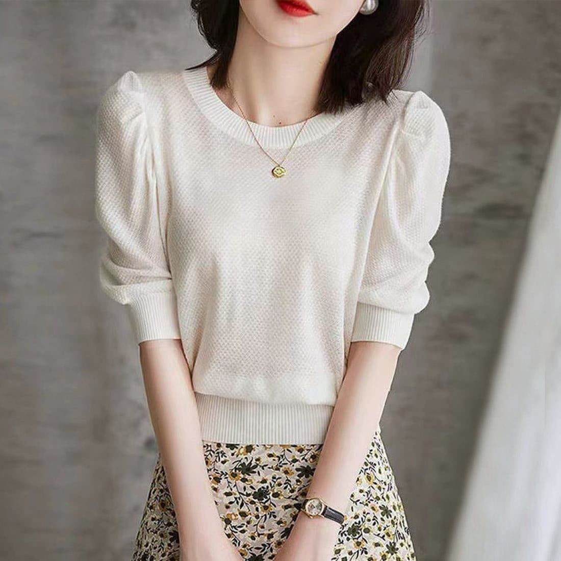 女性らしさを引き立てるふっくらとしたパフスリーブで大人可愛い印象に見せてくれる半袖ニットが登場♪<br>