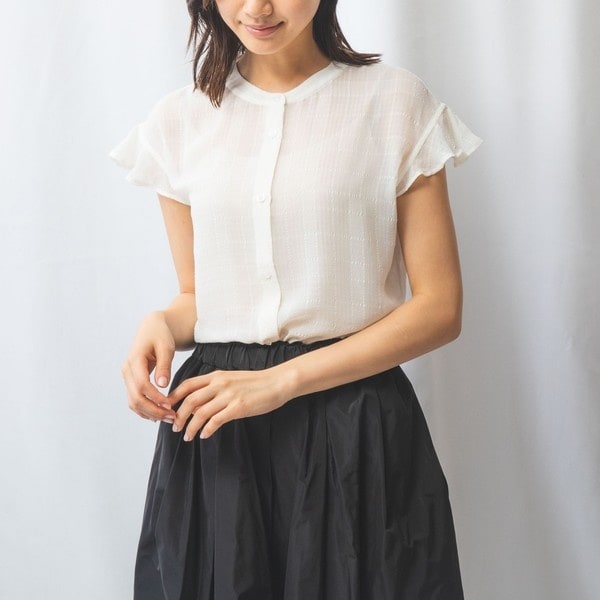 チェック柄のサッカー生地が爽やかなブラウス。首のラインや顔周りをすっきりと見せるラウンドネックが上品な印象を演出。袖にはフリルをふんわりと施し、フェミニンさ薫るデザインに仕上がっています。旬のシアー素材を使用しており、こなれ感のあるレイヤードスタイルを演出。カジュアルな日常使いから、休日のお出かけスタイルにと、幅広い着こなしのアレンジが楽しめるアイテムです。