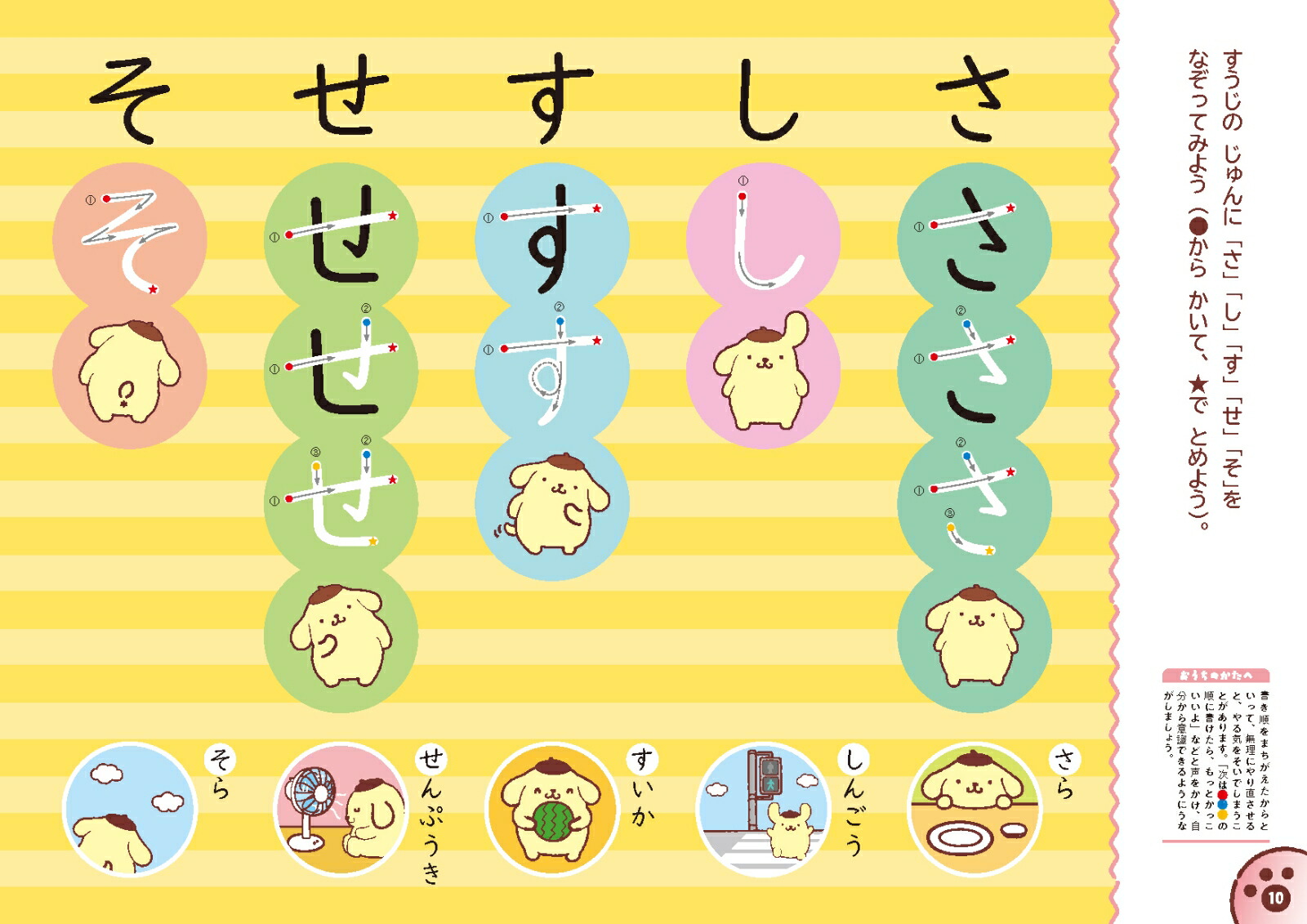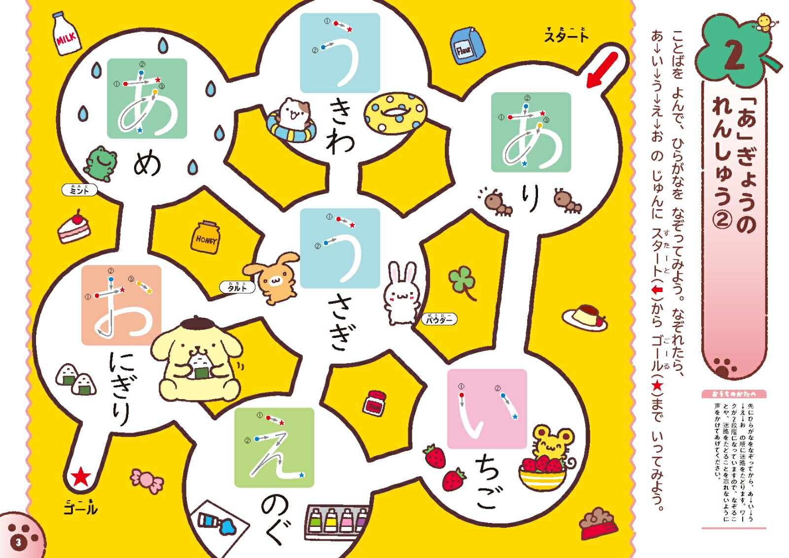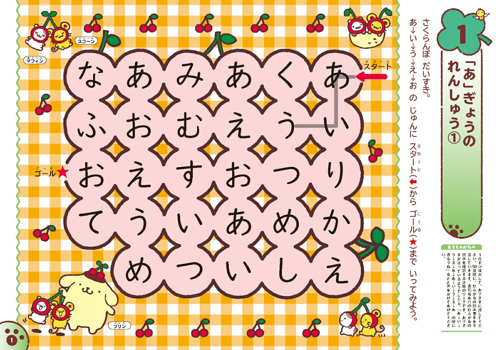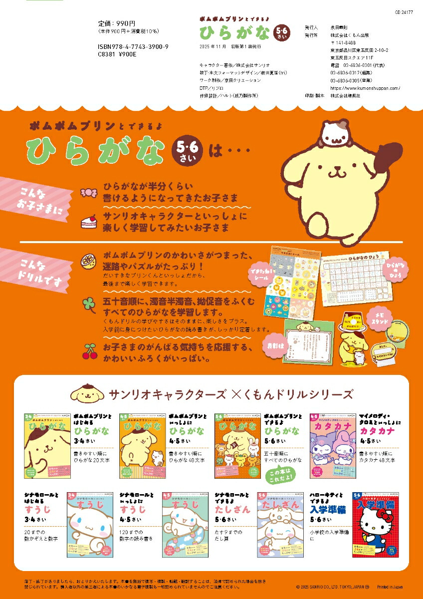 ポムポムプリンといっしょに、ひらがなのおべんきょうをやってみよう!《こんなお子さまに》ひらがなが半分くらい書けるようになってきたお子さまサンリオキャラクターといっしょに楽しく学習してみたいお子さま《こんなドリルです》★ポムポムプリンのかわいさがつまった、迷路やパズルがたっぷり!★だいすきなプリンくんといっしょだから、最後まで飽きずに学習できます。★五十音順に、濁音半濁音を含むすべてのひらがなの読み書きを練習します★くもんドリルの学びやすさはそのままに、楽しさをプラス。無理のないくり返し学習でしっかり身につきます。★かわいいふろくがいっぱい!★キラキラ光る「できたね!シール」、表彰状、「ひらがなのひょう」、組み立てふろく(書いて消せるメモスタンド)と充実のふろくで、お子さまのがんばる気持ちを応援!