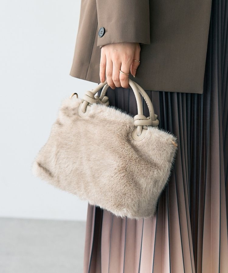 手触りの良い滑らかな起毛フェイクファーにレザー調素材のハンドルが洒落感たっぷりなデザインです。