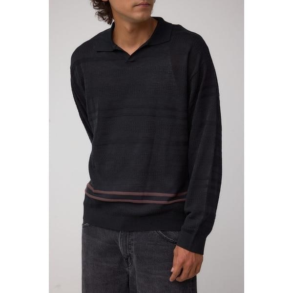 ■編地変化長袖ニットポロ■ポイント編地変化のある長袖ニットポロシャツになります。■ディテール2サイズでベーシックなデザインになります。ドライタッチの強撚のアクリルを使用した、サマーニット。地柄とボーダーの編み切り替えでAZULらしいデザインに。スキッパー襟とライン配色がさりげないアクセントになっています。多少透け感があり夏場でも着ていただけます。■スタイリングシンプルなデザインなので、デニムと合わせてカジュアルに、トラウザーと合わせてキレイめにと、幅広いスタイリングにマッチします。■生地ドライタッチの強撚のアクリルを使用。細かい目の透かし編みを編んでいますので、ハンガー掛けの際、商品全体が伸びます。サイズ違いの原因にもなりますので、こまめに、ハンガーから外すなどご注意下さい。ハイゲージの透かし編地ですので、引っ掛かりやすい編地になります。取り扱いは丁寧に、十分にご注意ください透け感:あり裏 地:なし伸縮性:なし光沢感:ややあり[注意事項]※画像の商品はサンプルです。実際の商品と仕様、加工が若干異なる場合があります。※画像の商品は光の照射や角度、お使いのモニター環境により、実物と色味が異なる場合がございます。※着用、お取り扱いの際は、アテンションタグをご確認ください。