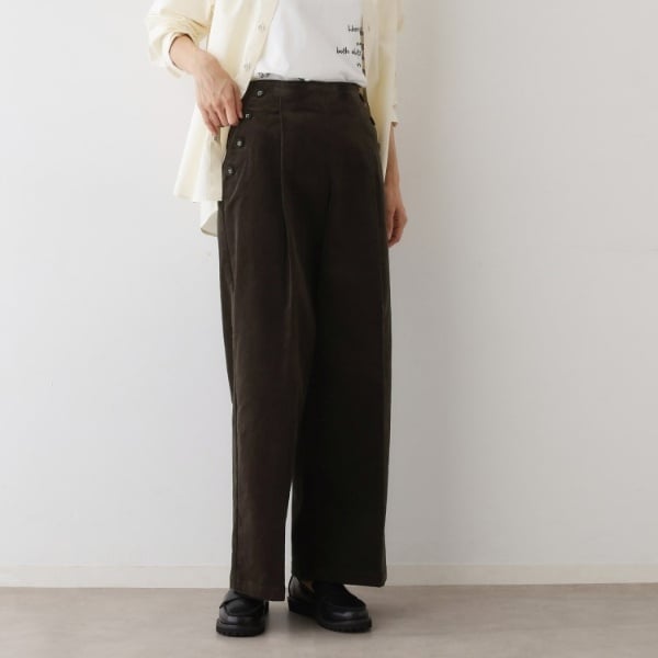 ワンタック入りワイドシルエットの脇明きでフロント部分がすっきりとしたデザインになっています。