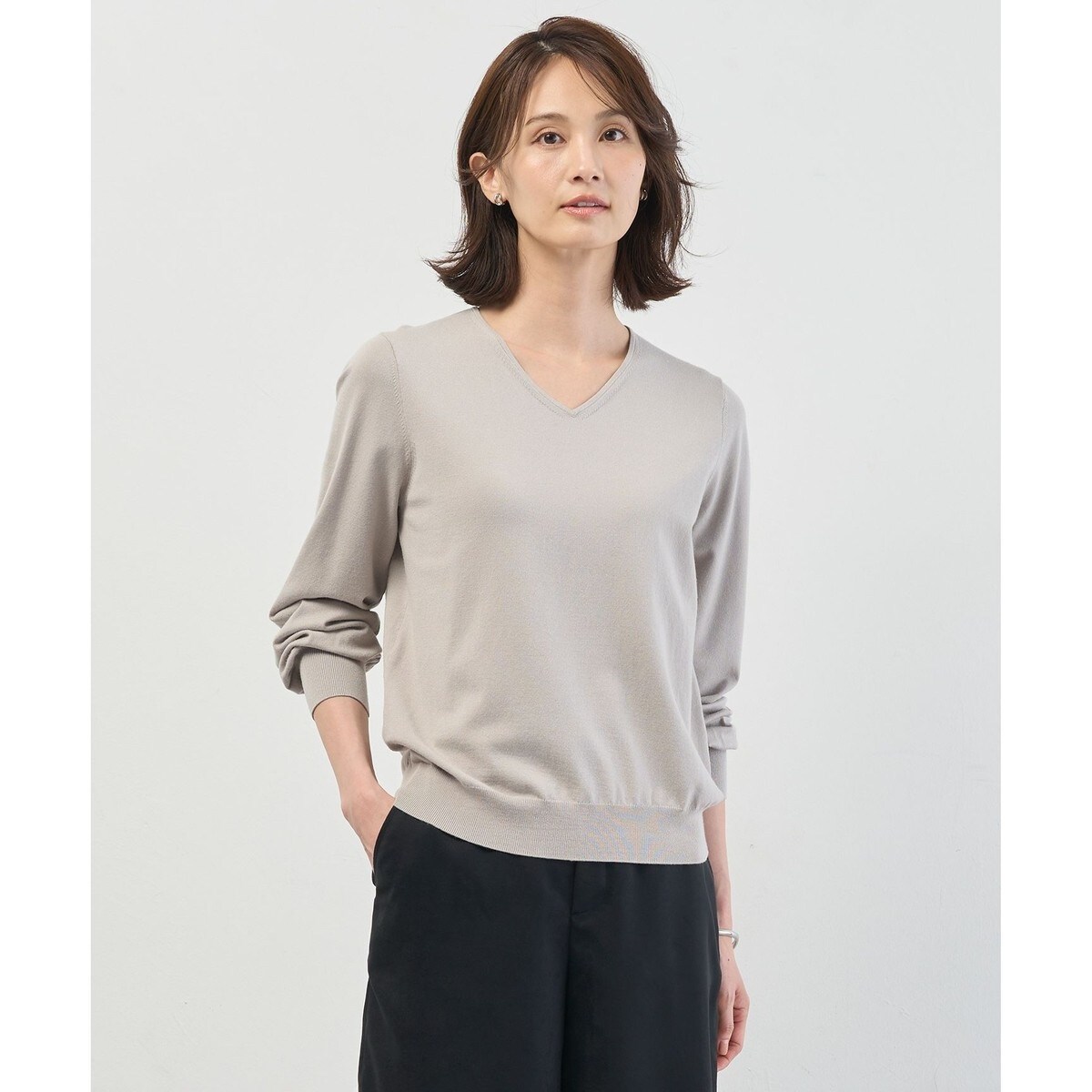 ■デザイン顔周りをすっきり見せる、人気の定番Vネックニット。開きすぎない上品なネックラインは、パイピングで繊細に仕立て、きちんと感と女性らしさのある表情に。インナーを選ばず1枚でもサマになるバランスで、年代やシーンを問わず活躍する、長く愛せるベーシックアイテムです。カラーは、上品で落ち着きのあるグレージュ(#003)、シックで引き締まった印象のブラック(#005)、華やかで女性らしいピンク(#012)、肌なじみの良いナチュラルなトップベージュ(#033)、明るく気分を上げてくれるイエロー(#040)、清潔感のあるさわやかなブルー(#074)、軽やかでフレッシュな印象のミント(#062)、優雅で上品なニュアンスカラーのラベンダー(#083)、優しくフェミニンなピンク1(#112)の9色の展開です。
