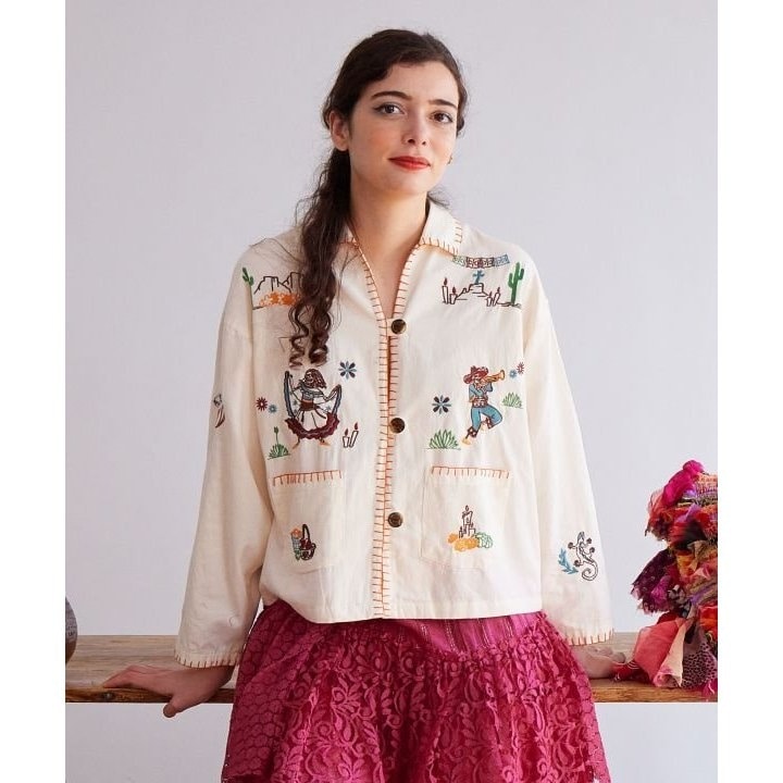 メキシコモチーフの手刺しゅうが温もりを感じさせるシャツ。メキシカンジャケットと、メキシコの正装「グアジャベラ」の要素を掛け合わせた、唯一無二のシルエット。さらに、華やかな色使いとストーリー性を感じる配置にこだわった、大胆でカジュアルな刺しゅう。細部まで施されたブランケットステッチが目を引く、着るだけで主役になれる一枚です。滑らかな肌触りでシャツアウターとしても着用可能。刺しゅうのモチーフはメキシコの「死者の日」に飾られる祭壇「オフレンダ」。死者の好物やマリーゴールド、キャンドル、パぺル・ピカドなど様々配置しました。