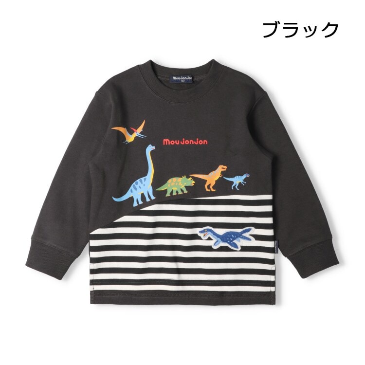 秋から春まで長く着られる裏毛素材のトレーナー、スウェット。無地とボーダーの切替デザインがお洒落!男の子が大好きな恐竜のプリント入り!ボーダー部分の恐竜はワッペンになっているのもポイント!【アイテム】トップス カジュアル お洒落 オシャレ かっこいい かわいい 可愛い 普段着 デイリーウェア お出かけ着 お外着 お外遊び着 子ども服 こども服 男児 男の子 ボーイズ キッズ ベビーサイズ トドラーサイズ 幼稚園 保育園 小学校 通園 通学 小学生 2025年秋冬物新作 丸高衣料 ロングスリーブ 長袖 黒色 ブラック オフホワイト 白色 ムージョンジョン コットン100% 綿100% ティラノサウルス トリケラトプス プテラノドン プレシオサウルス ムージョンジョン ダイナソー