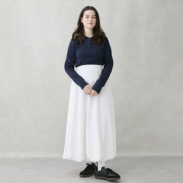 衿つきデザインが上品な印象を与えるロンTとバルーンロングスカートのセットです。