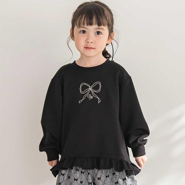 リボン刺しゅうがきらりと光る、ガーリーな裾フリルの女の子用トレーナー。