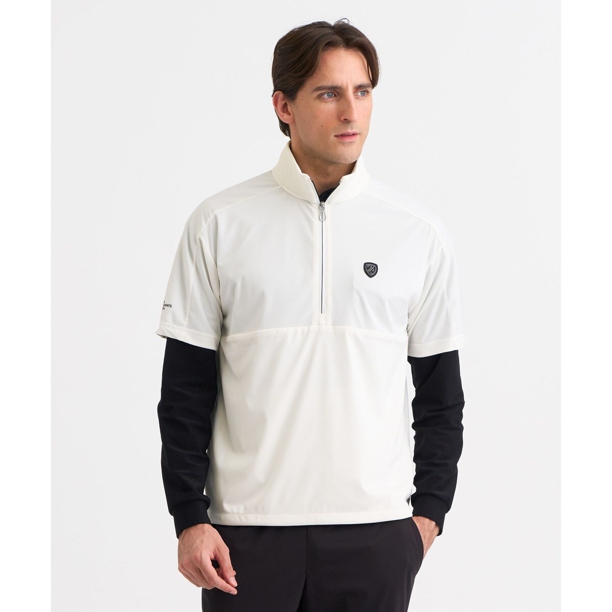軽量でストレッチ性抜群。重ね着もしやすい半袖プルオーバー■デザイン半袖タイプのプルオーバー。ハーフジップ仕様で体温調節がしやすく、快適な着用感を実現しました。衿部分にはロゴのエンボス加工を施し、スポーティーなアクセントに。裾はドローコード仕様でサイズ調節が可能で、寒い時期には裾を絞り風の侵入を防げます。暑い時期はこれ1枚で、涼しくなってきたらインナーにモックネックをレイヤードして。その日の気温や気候に合わせたコーディネートを楽しめます。急な小雨や肌寒い朝にも対応でき、コンパクトに持ち運べる万能アイテムです。■素材【エアリージャージー】マットで上品な質感が魅力のポリエステル・ハイゲージニット素材。編地ならではの高いストレッチ性を持ち、動きやすさは抜群です。撥水性に加え、裏面にはアクリルコーティングを施すことで防風機能もプラス。シワになりにくく、軽量で持ち運びにも便利なので、ラウンドや旅行のお供にも最適な多機能素材です。