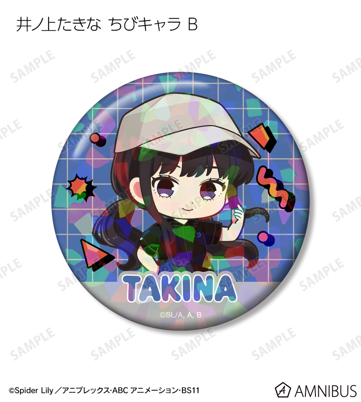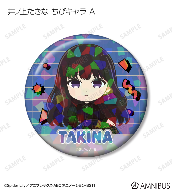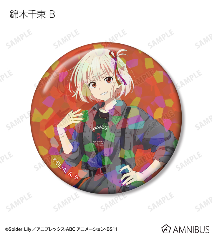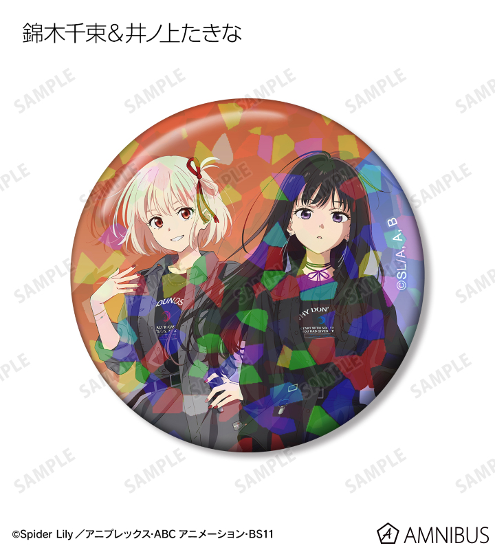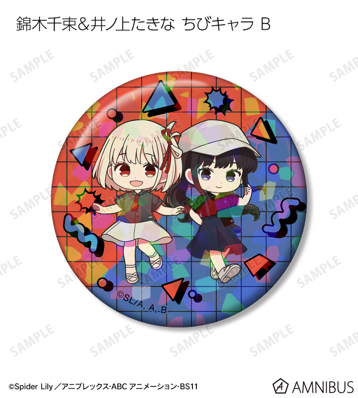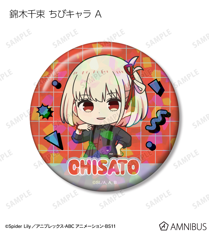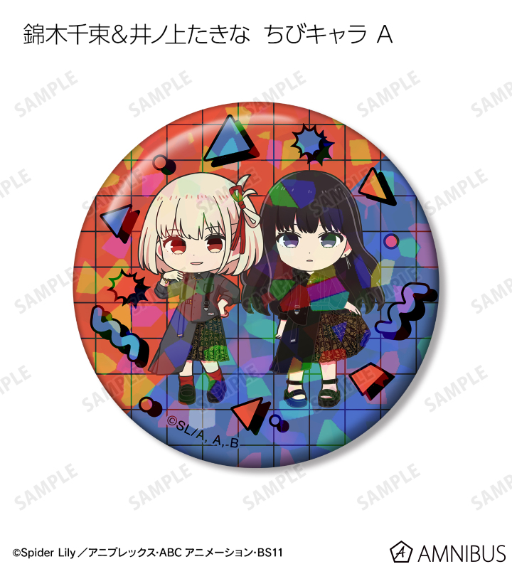 錦木千束、井ノ上たきなの描き下ろしイラスト、描き起こしちびキャライラストをホログラム加工を施した缶バッジに仕上げました。