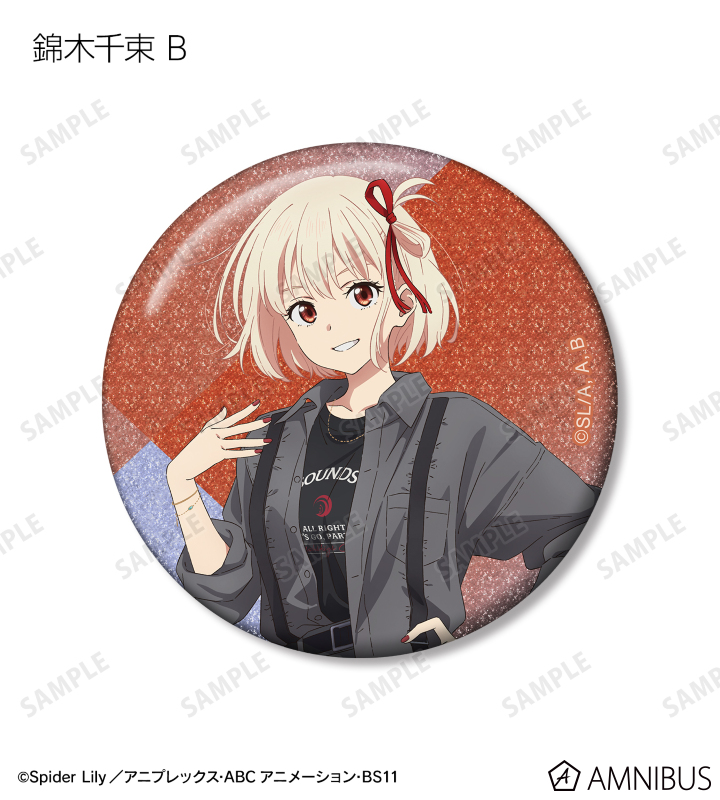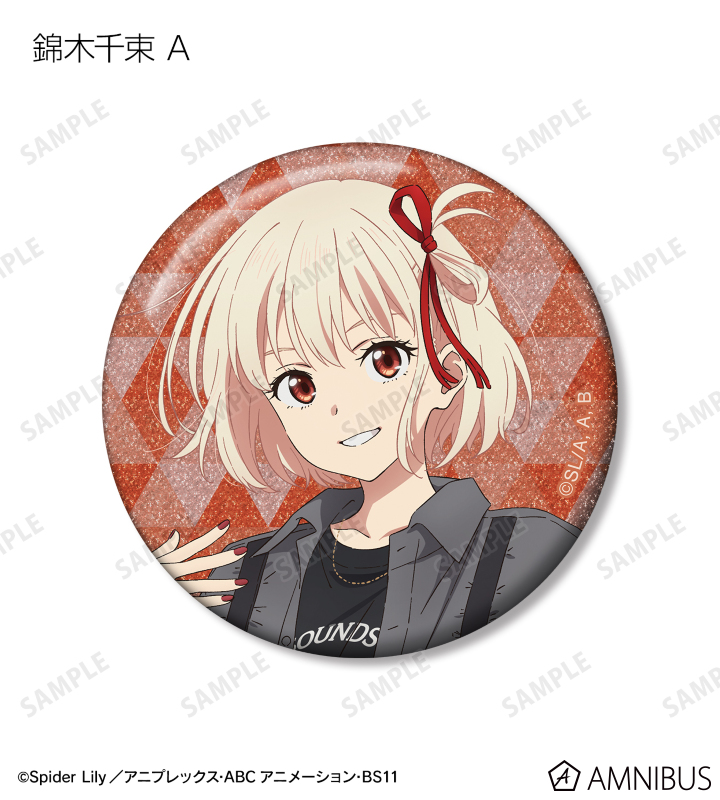 TVアニメ「リコリス・リコイル」×「meagratia」のコラボレーションアイテム「meagratiaコラボ 描き下ろし&ちびキャラ トレーディンググリッター缶バッジ」の登場です。