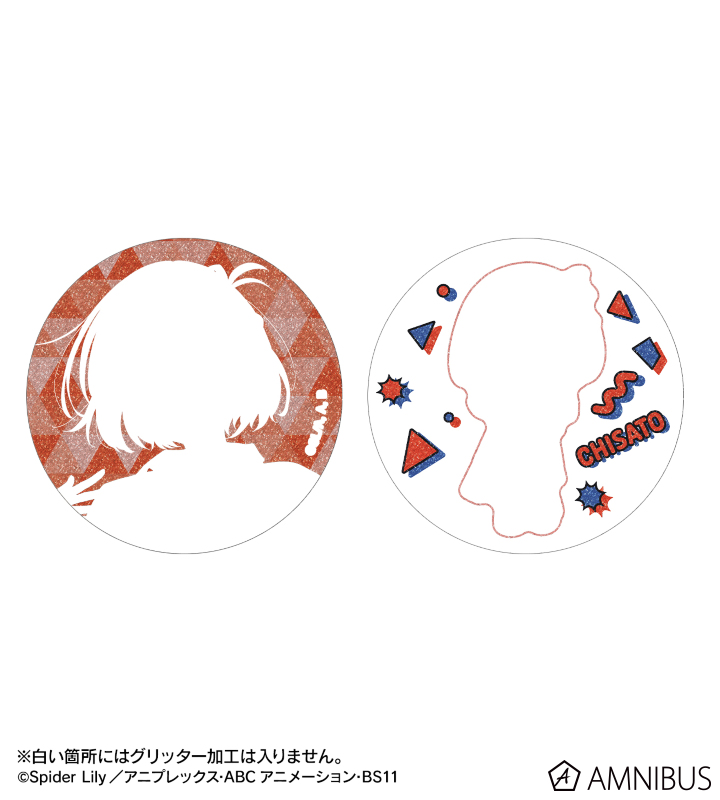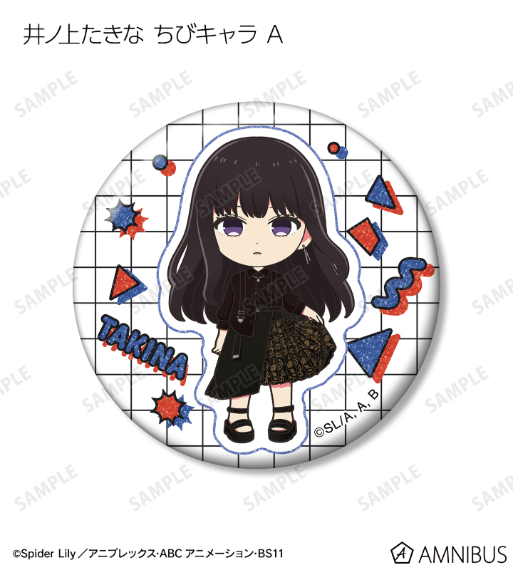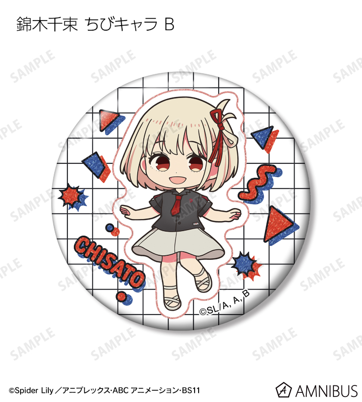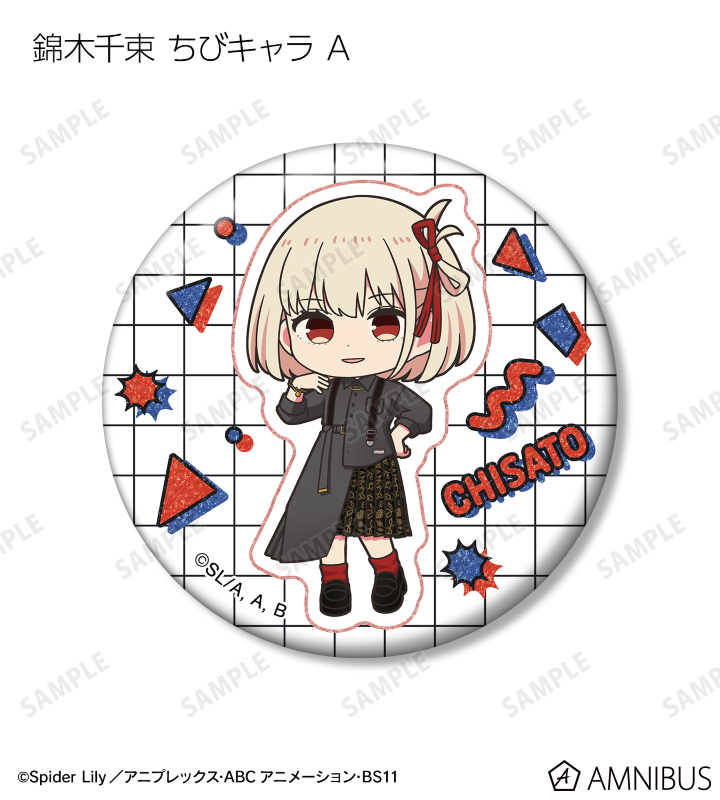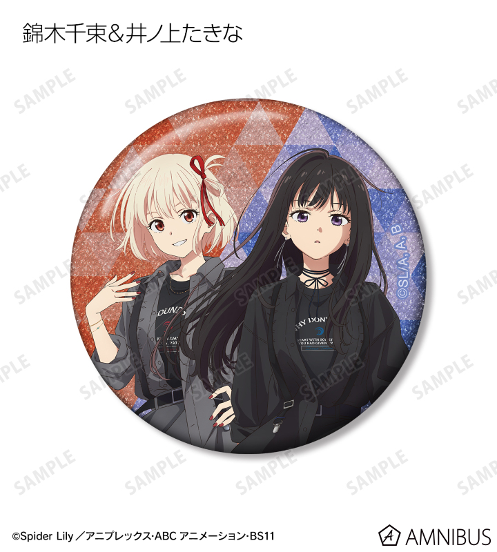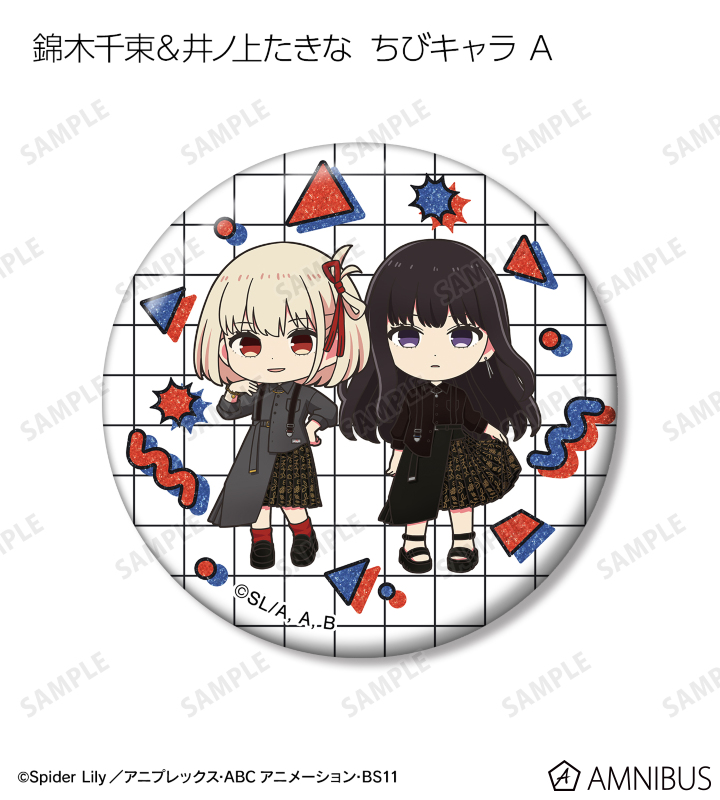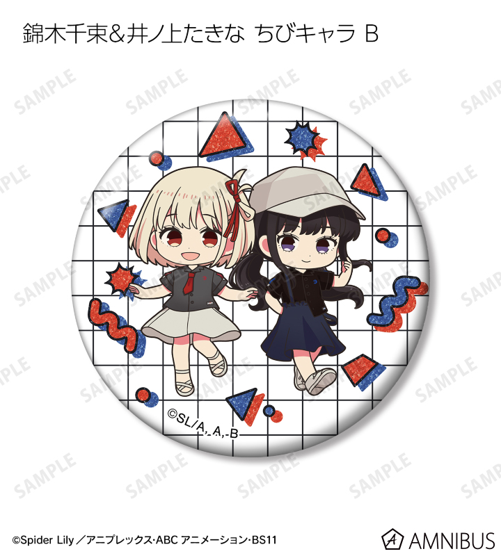 錦木千束、井ノ上たきなの描き下ろしイラスト、描き起こしちびキャライラストをグリッター加工を施した缶バッジに仕上げました。