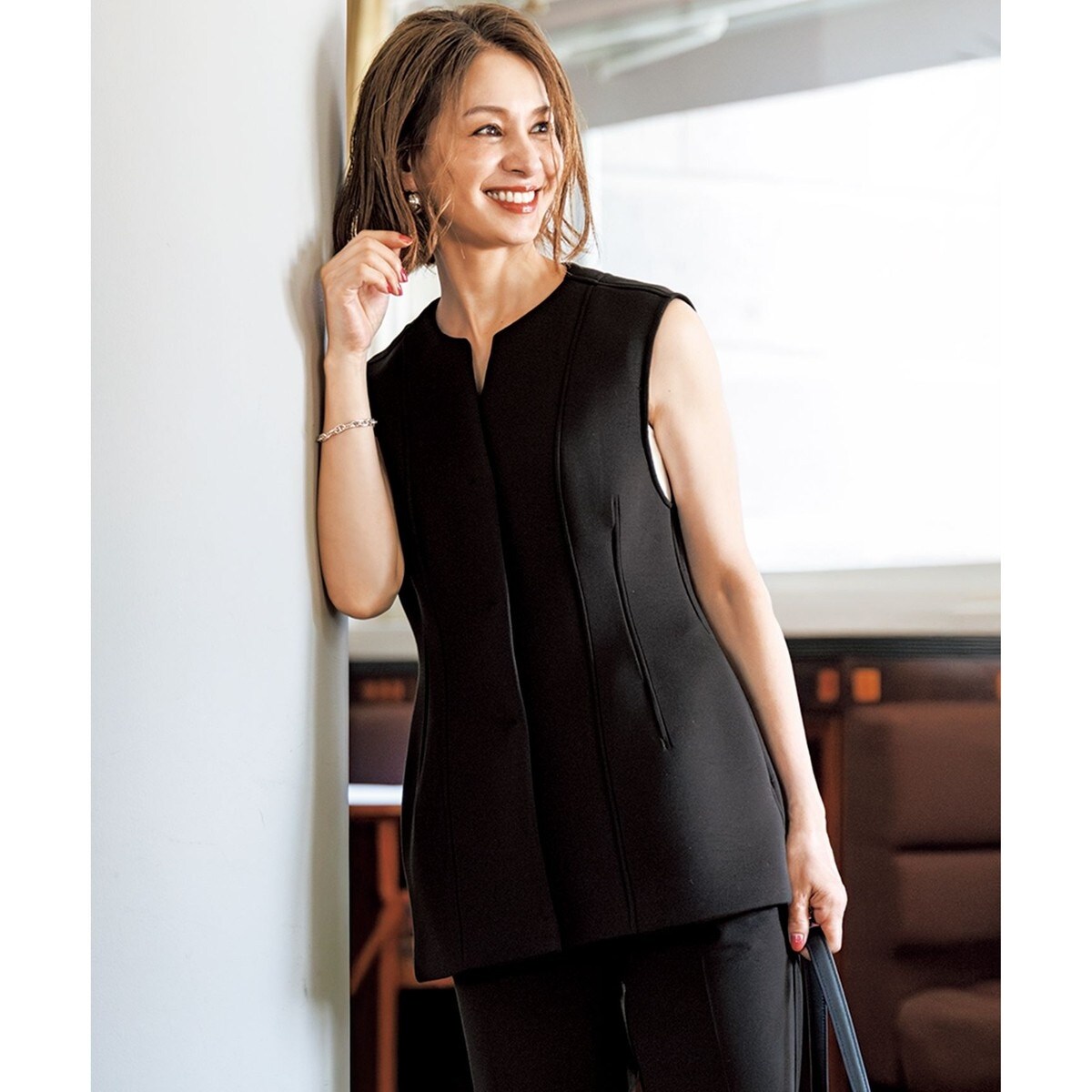 一枚で即こなれ感の叶う、VERYとの最強コラボジレ。ウエストが程よくシェイプされた構築的なシルエットでありながら、裾にかけて身体から離れる立体的なパターンでスタイルアップ効果を期待できるジレです。パネルラインで作る女性らしいしなやかなカーブは360°どこからみても美しいラインを演出します。フロントのキーネック効果で顔周りもすっきりと。気になるヒップ回りも自然にカバーしてくれる丈感なので、安心してご着用いただけます。広めのアームホールで、インナーを選ばずレイヤードスタイルをお楽しみいただけます。真夏はトップス感覚で、秋にはブラウスとレイヤード、と一枚でロングシーズン活躍してくれる着回し力の高いアイテムです。