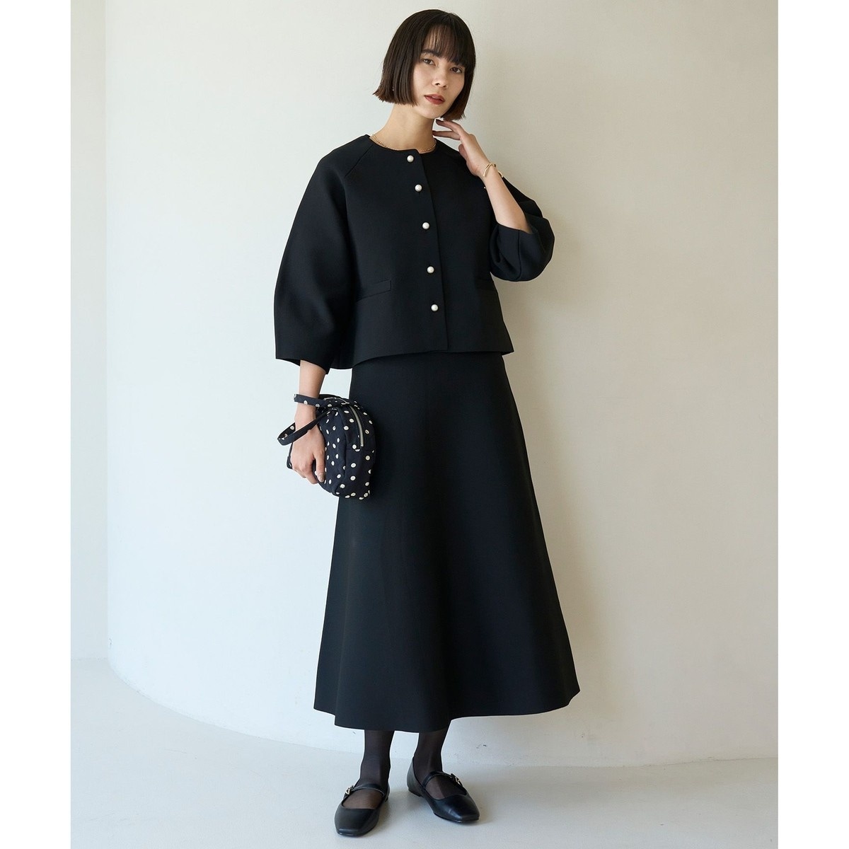 ■素材軽い着心地でハリ感、ストレッチ性があり、きれいなフォルムを出してくれるシーズンレス素材。サラッとした肌触りでピリングもしにくく、お家洗いしても型崩れせずお手入れしやすいのも嬉しいポイント。