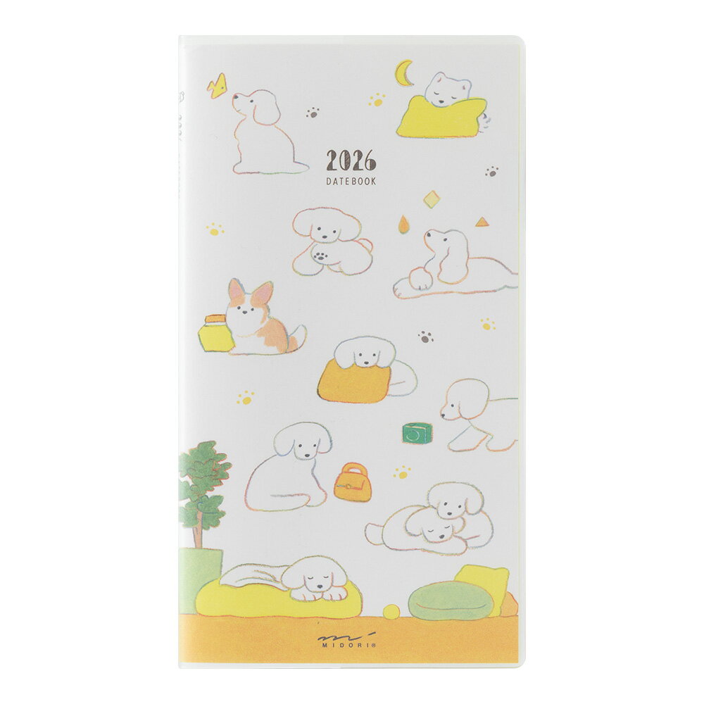 人気のイラストレーター「てらおかなつみ」さんを起用し、犬種を問わない、かわいいイヌを色彩豊かに描いたダイアリーです。2026年版はお話の1ページのようなシーンと一緒に、ページをめくるたびに新鮮な気持ちで季節の変化が楽しめる構成になっています。鮮やかな色彩や虹色の主線で描かれたかわいいイヌのイラストを、紙面いっぱいに広がるレイアウトにこだわりました。薄く携帯性に優れたスリムサイズは、見開きで1ヵ月のスケジュールが管理できる「月間ブロック」タイプ。カバーの内側には便利なペンホルダー付き。メモページにはその年の出来事や印象に残ったことを書き込める「マイメモリーズ」が付いています。●日付期間(掲載期間):2026年1月〜2027年3月●罫内容:月間ブロック●記入欄:年間カレンダー、年間スケジュール、メモ、マイメモリーズ、パーソナルページ、月曜日始まり●サイズ(判型):スリム●寸法:H180mmW99mmD5mm●表紙:表紙/ PVC 製、ペンホルダー付●中紙:MD PAPER●ページ数:48p