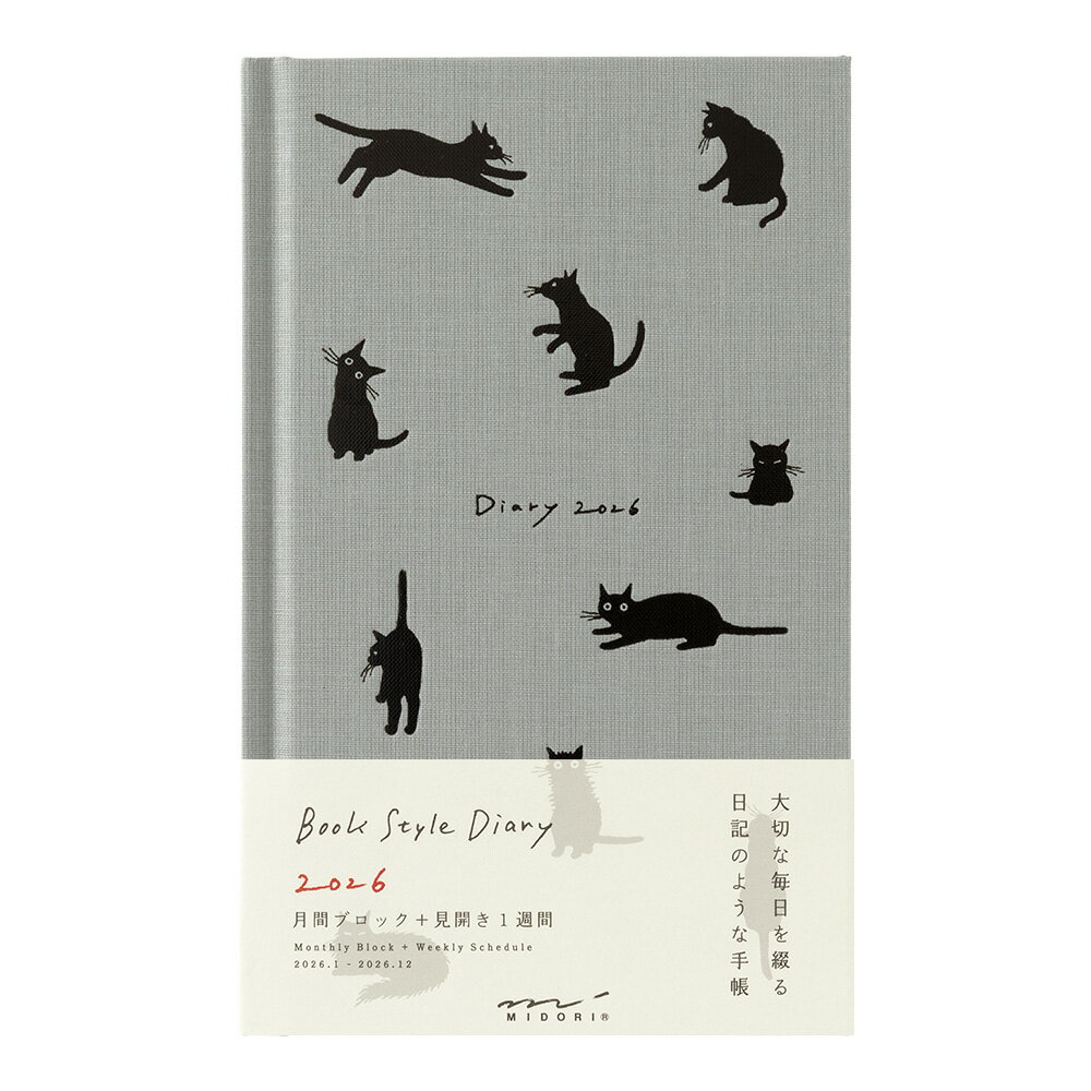 毎日の出来事を日記のように書き記すダイアリー。書き終えた後も大切にしたい、本のような形が魅力です。本文は1ヵ月の予定が一覧できる月間ページ、中心を区切ってたくさん書ける週間ページのほか、記録を残すためのおまけページも充実。糸かがり綴じの製本で180度フラットに開くため、ストレスなく文字を書き込むことができます。表紙は、布クロスで本のような佇まいに仕上げ、アクセントに箔押しを施しました。「ネコ柄」イラストレーター「小泉さよ」さんが描く、ドローイングのような柔らかなタッチのイラストを毎ページお楽しみいただけます。「黒猫との暮らし」がテーマです。●日付期間(掲載期間):2026年1月〜2026年12月●罫内容:月間ブロック+見開き1週間●記入欄:年間カレンダー、年間スケジュール、メモ、思い出ページ、ギフトリスト、ギャラリーページ、パーソナルメモ、月曜日始まり●サイズ(判型):B6変形●寸法:H185mmW113mmD14mm●表紙:表紙/布クロス貼り ●中紙:MD PAPER●ページ数:176p