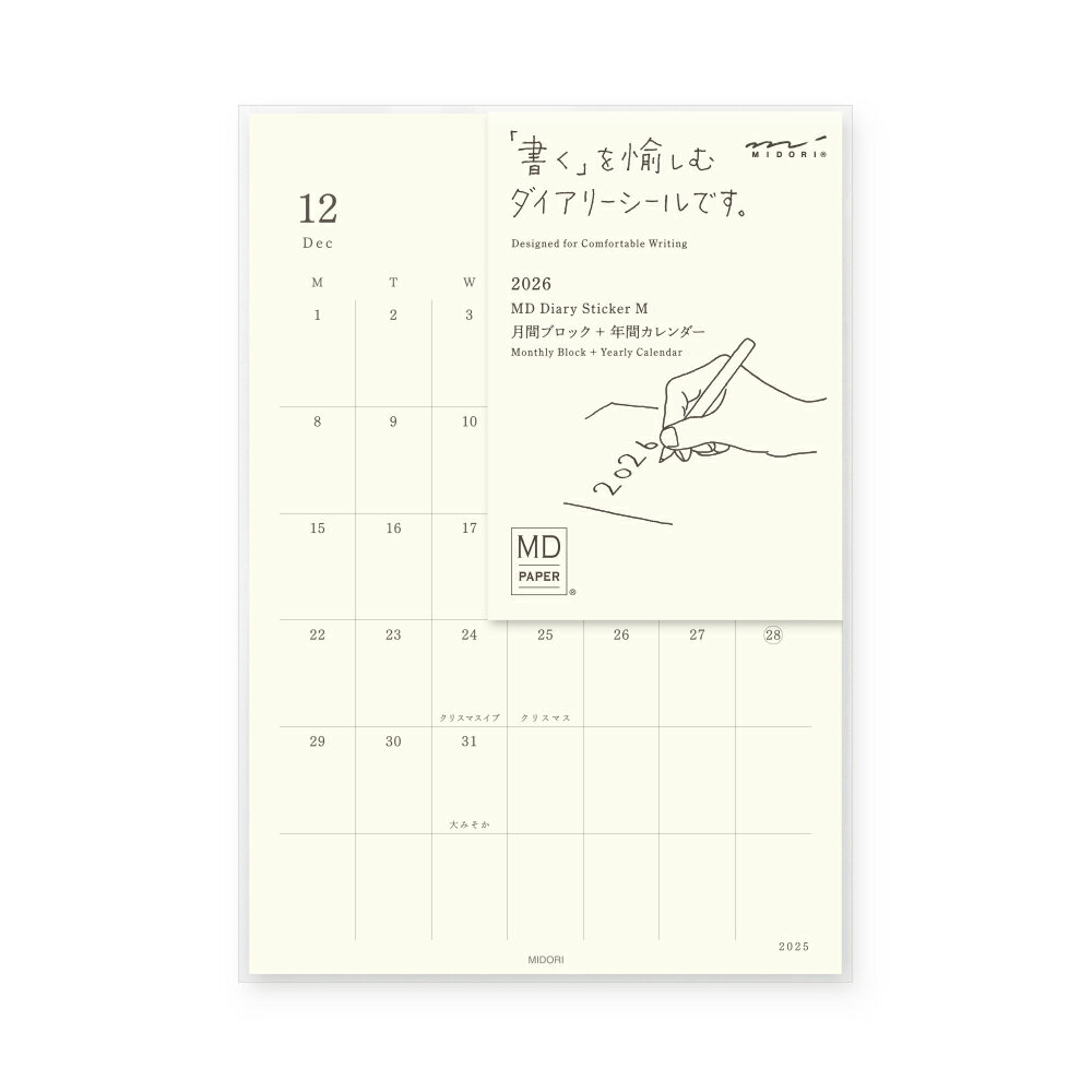 月間ブロックダイアリー14ヵ月分(2025年12月〜2027年1月)と、年間カレンダー2年分(2026年、2027年)の計16枚がセットになったシールタイプのダイアリーです。一般的なダイアリーのように、書く場所やページ数を気にすることなく、ノートの好きなページに貼って使ったり、『MDノートライト』に貼って軽快に持ち歩いたりと、自分仕様のオリジナルダイアリーとしてお使いいただけます。「MD用紙」(クリーム)を使用しているので、『MDノート』と一体化し、書き心地もしっかりお愉しみいただけます。●日付期間(掲載期間):2025年12月〜2027年1月●罫内容:月間ブロック●記入欄:年間カレンダー、月曜日始まり●サイズ(判型):M●寸法:H172mmW128mmD8mm●表紙:仕様/シール加工●中紙:MD PAPER●ページ数:16枚
