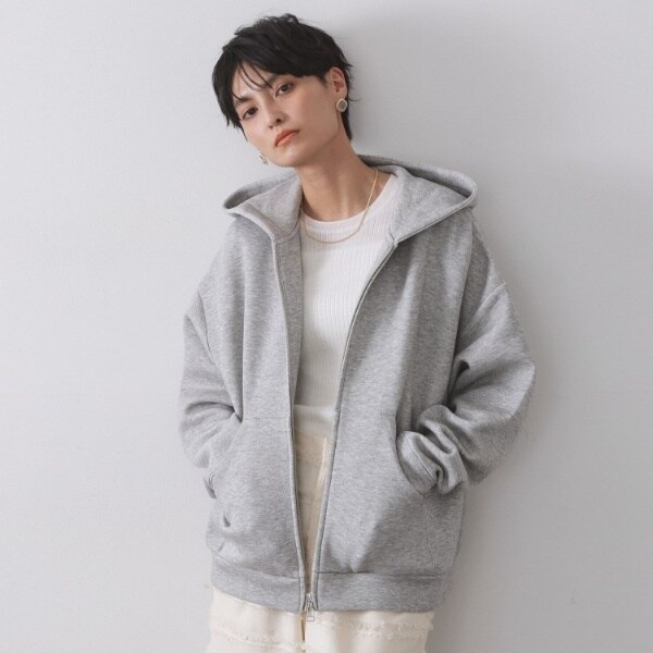 ・ふくらみのあるダンボール素材が特徴の、ファスナータイプのフーディーです。
