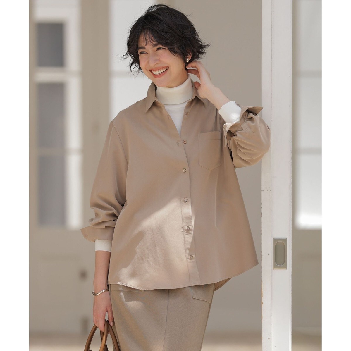 ■デザインオーセンティックなシャツデザインを、今年らしいフォルムに落とし込んだシャツ。ややオーバーサイズのAラインシルエットと、少し長めの着丈が相まって、抜け感のあるスタイルに仕上がっています。釦を開けて襟を後ろに引いた、抜け感のある着こなしもおすすめで、リラックス感と女性らしさを両立。ボリュームのあるボトムスともバランスよく合わせられ、ウエストイン・アウトのどちらもすっきり決まります。同素材のパンツと合わせたセットアップスタイルもおすすめです。裏地無しで、秋口でもさらっと着こなせます。