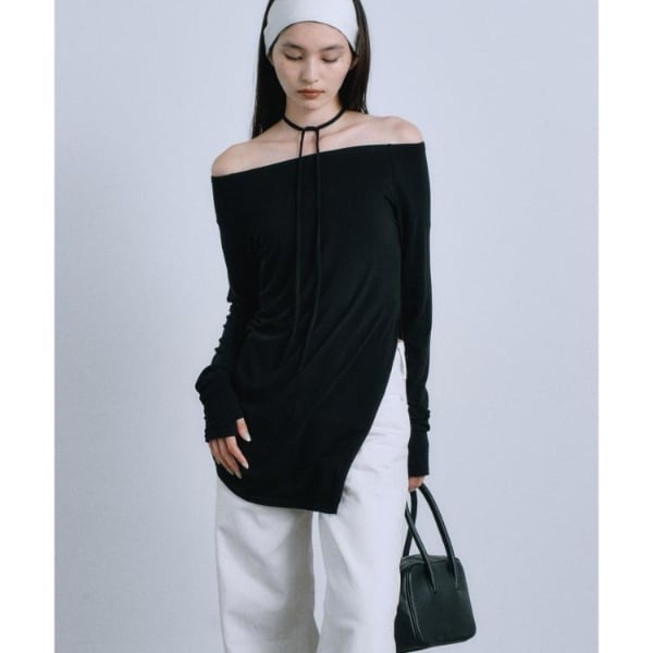 首元が広く開いたボートネックは、ストレッチ性が高く、オフショルでも着られます。