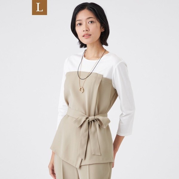 トレンドのビスチェを重ね着したように見える異素材コンビのプルオーバーです。ウエストから裾にかけて広がるすっきりとしたAラインシルエットで、コンパクトなサイズ感はジャケットのインナーとしても最適です。ウエストリボンは取り外し可能で、さまざまなスタイリングをお楽しみいただけます。同素材のパンツ(U3R03613)とのセットアップスタイルもおすすめです。