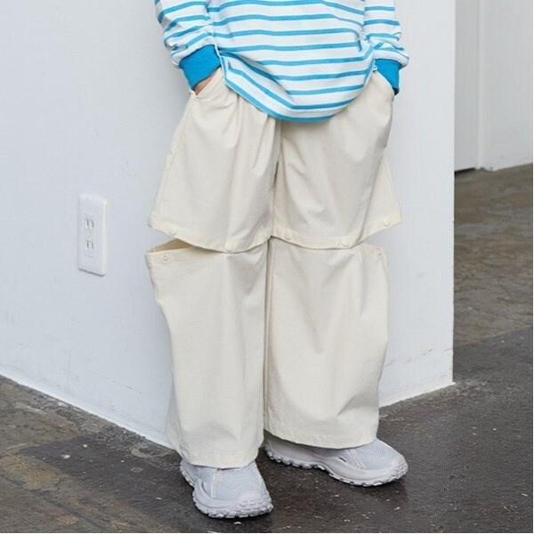 気分に合わせて丈チェンジ!スナップボタンで簡単丈調整!ロング丈とショート丈、2つのスタイルを楽しめるイージーパンツ。