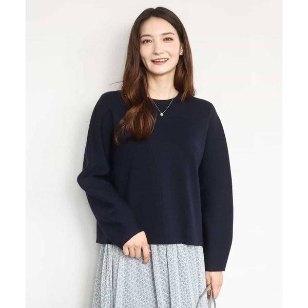 ニットならではの引き返し編みを使った立体的なシルエットが特徴のプルオーバー。パフスリーブに、後ろ釦のデザインがどの角度から見てもポイントに。