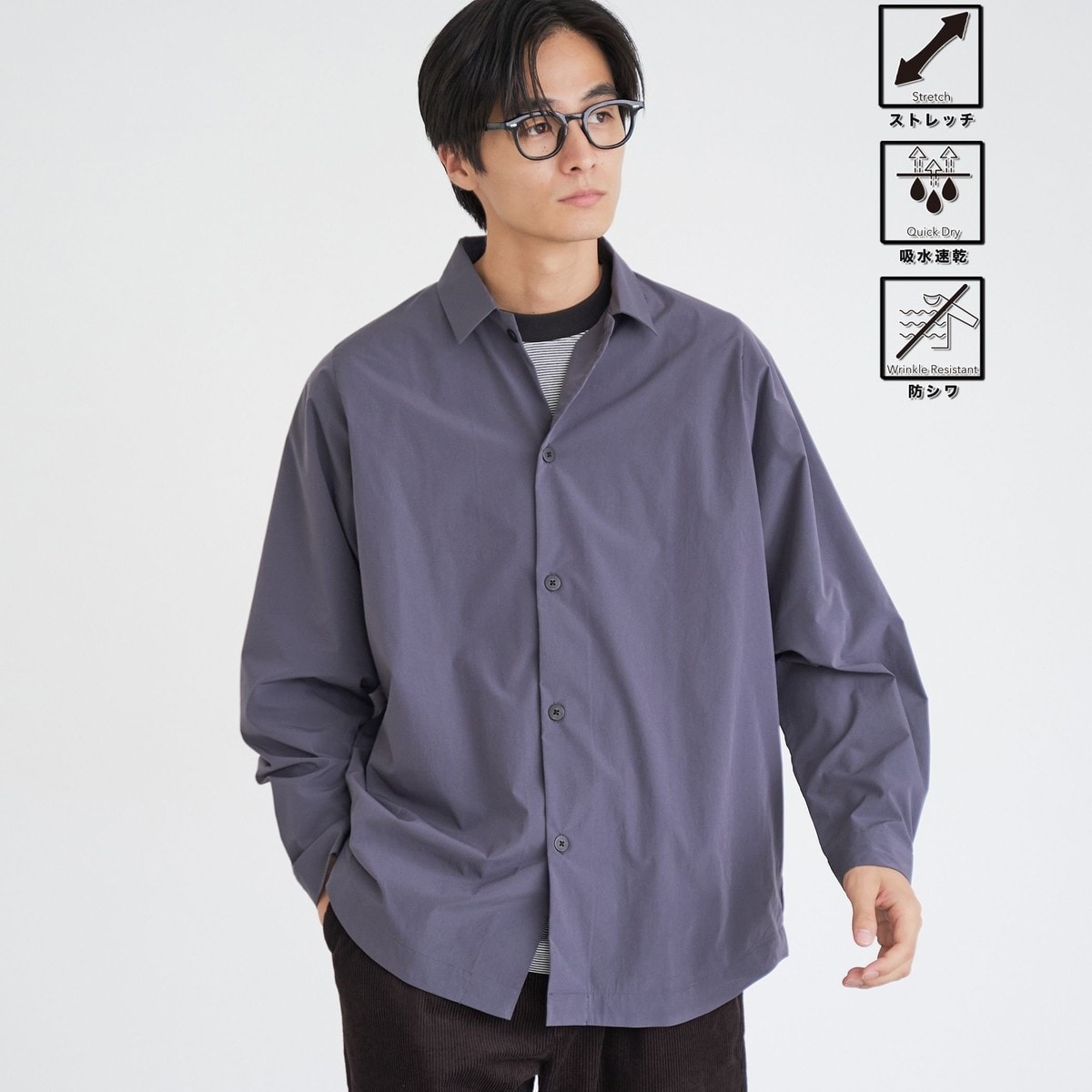 洗濯機で洗えて、ストレッチ・吸水速乾・防シワと、うれしい機能が満載のシンプルシャツ。