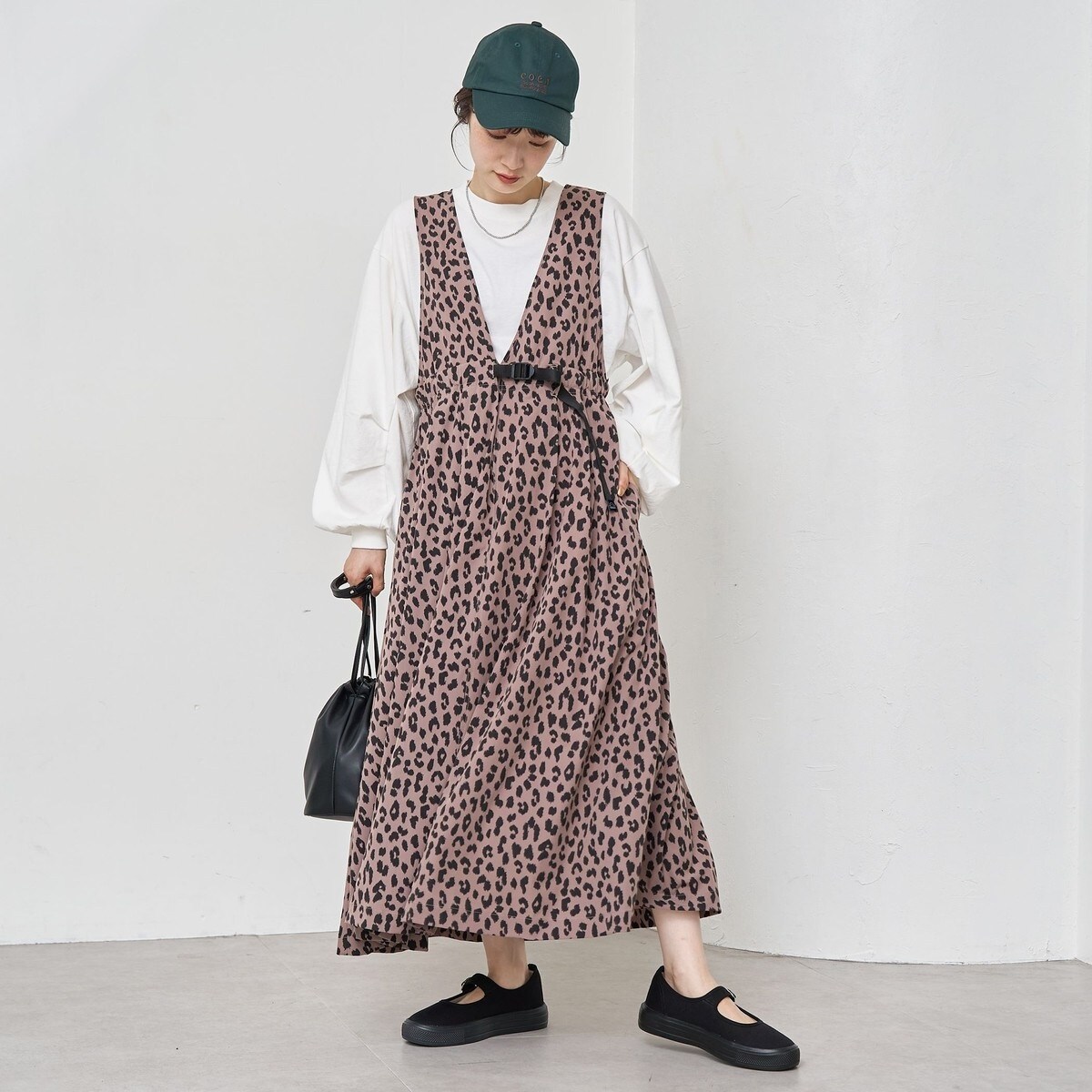 ざっくりと深めに開いたVネックに、レディライクなフレアシルエットを組み合わせたジャンパースカート。
