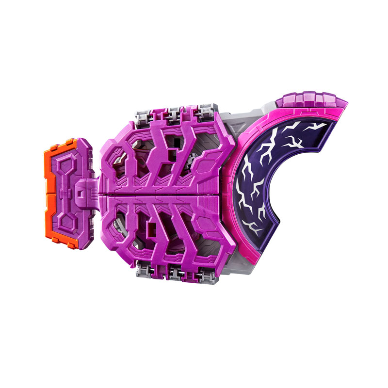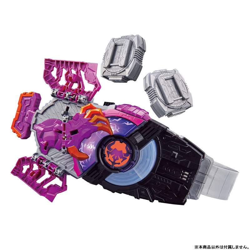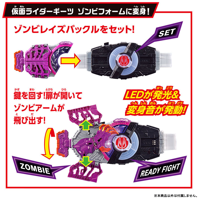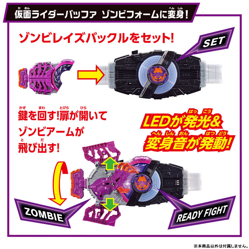 ゾンビフォームへの変身遊びができるレイズバックルと、レイズバックルを収納できるホルダー2個、仮面ライダーバッファのコアIDのセット商品。ゾンビレイズバックルは鍵を回すとゾンビアーム飛び出しギミックで変身!