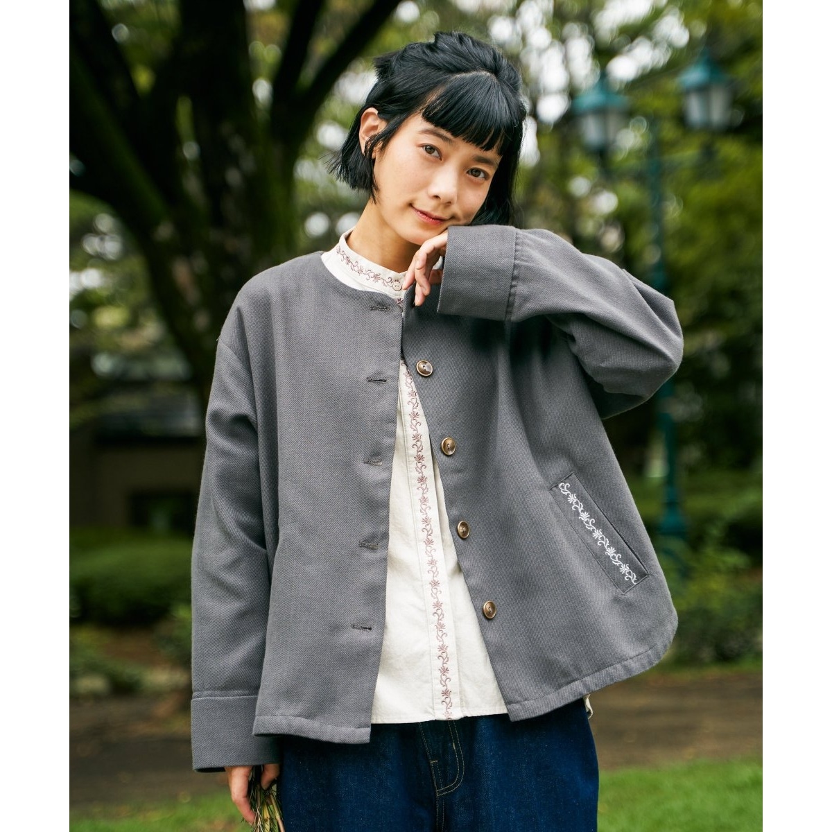 ポケット部分に施した刺繍がアクセントになり、無地アウターにはない個性を添えます。