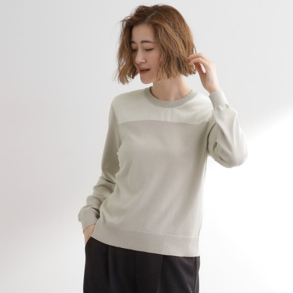胸元の配色でさりげなく魅せる、上品な丸首ニットプルオーバー。