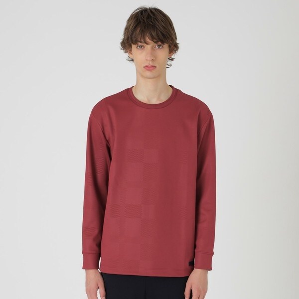 全面にシャドーチェックをあしらった長袖カットソー。エンボス加工による凹凸のみでチェック柄を表現する事で、程良い存在感に仕上げています。コーディネートしやすく、一枚でも十分サマになる着回し力抜群の一着です。