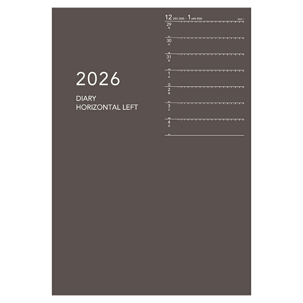 左半分が1週間のスケジュール、右半分が横罫のメモスペースになっており1週間の予定とメモを見開きで管理できる人気のレイアウトです。1週間の予定をざっくり把握したい、フリースペースにメモを取りたい人におすすめです。週間予定表の各ページには7時~24時までの時間軸が書かれているので、時間を細かく区切って管理しやすいのが特徴です。仕事で時間刻みのアポイントが入る営業職の方や、隙間時間を見つけて効率をあげたい方にもおすすめです。●日付期間(掲載期間):週間:2026年1月〜2026年12月●罫内容:週間●記入欄:1週間+横罫●サイズ(判型):A5●寸法:208×141×6mm●色:ブラウン●表紙:加工紙●中紙:手帳用紙●ページ数:112ページ