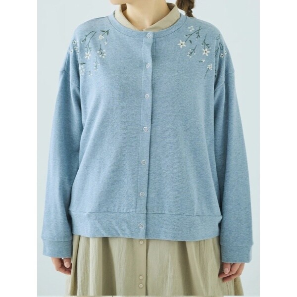 フロントに施された花刺しゅうがナチュラルなムードを演出するカーディガン。