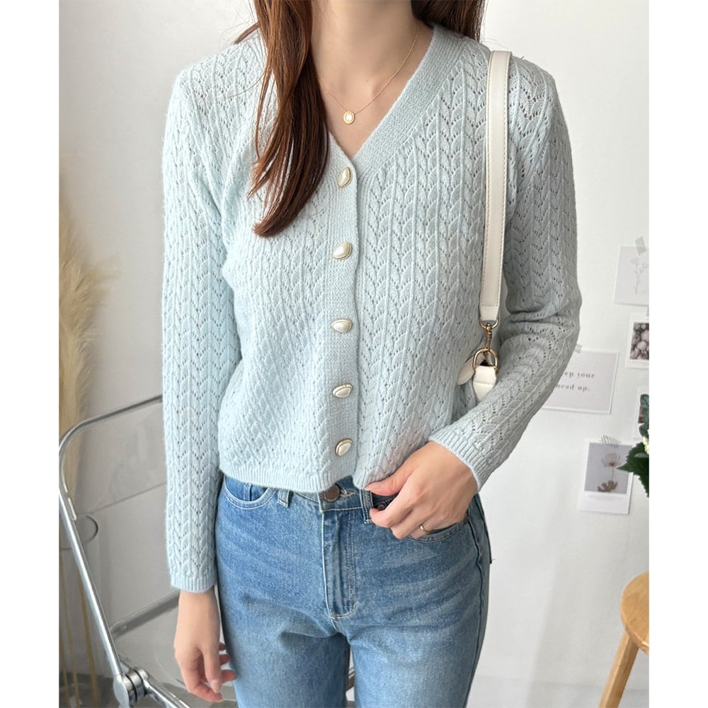 quaranciel:〈手洗い可能〉透かし編み Vネック コンパクト ドルマン ニット カーディガン