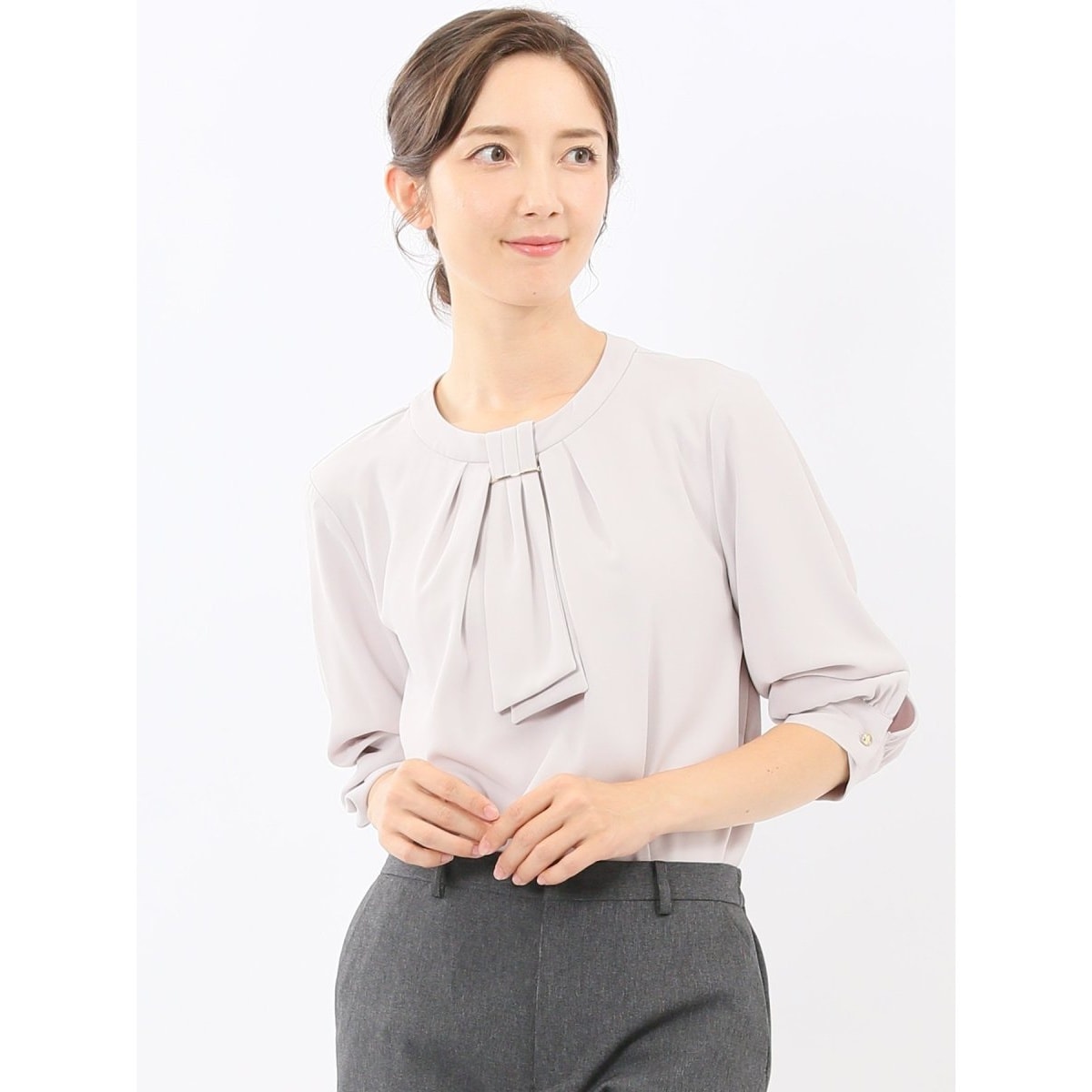 金具付きボウタイ風 長袖プルオーバーブラウス
