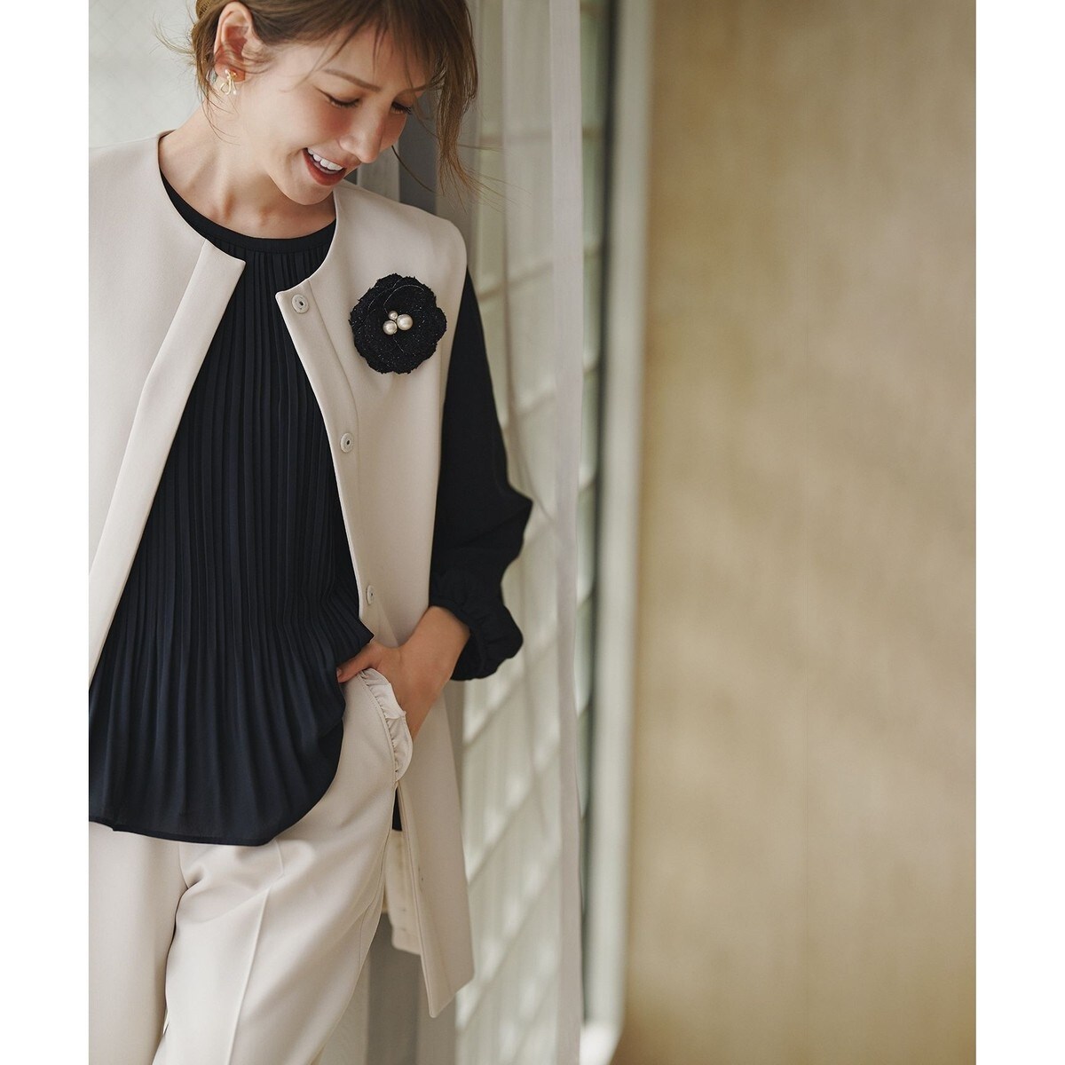 流れるようなプリーツが華やかな大人の上品ブラウス