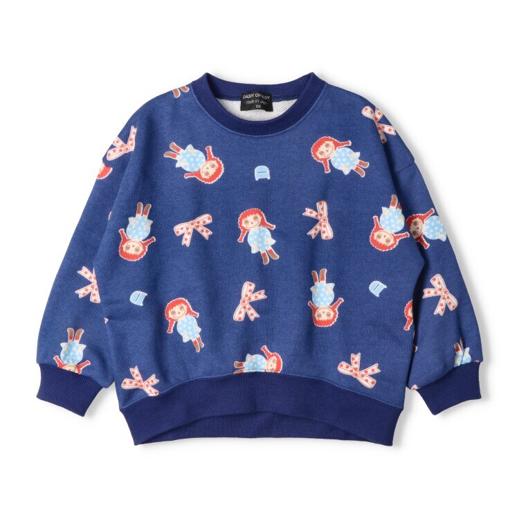 【安心の日本製】でギフトやプレゼントにもオススメ!ダディの人気の女の子のキャラクターのダディコちゃんの総柄プリント入り。秋から春まで長く着られる裏毛素材のトレーナー、スウェット。(ベビーサイズのみ肩ボタン仕様になります。)【アイテム】トップス シンプル ガーリー フェミニン カジュアル お洒落 オシャレ かわいい 可愛い 普段着 デイリーウェア お出かけ着 お外着 お外遊び着 子ども こども 女児 女の子 ガールズ キッズ ベビーサイズ トドラーサイズ 幼稚園 保育園 小学校 通園 通学 小学生 2025年秋冬物新作 丸高衣料 ロングスリーブ 長袖 コットン100% 綿100% made in Japan メイドインジャパン 国内生産 ダディオダディ レッド 赤色 ネイビー 紺色