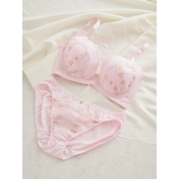 ほんのりと透け感のあるレース素材がレイヤードされたブラ&ショーツセット。